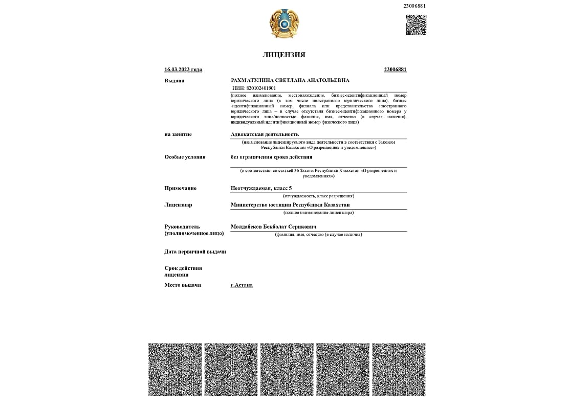 В нашем коллективе работают квалифицированные юристы с многолетним опытом, готовые помочь вам в решении самых разнообразных и сложных юридических вопросов. Специалисты нашей компании обладают всеми необходимыми разрешительными документами, что позволяет им представлять интересы граждан и юридических лиц в судебных органах Казахстана.